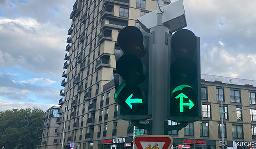 Les signaux lumineux avec silhouette de vélo ne concernent que les conducteurs de bicycles et des cyclomoteurs à deux roues. Quand la silhouette est entourée de flèches, le feu est simultanément au vert, orange-fixe ou rouge pour tous les cyclistes dans le carrefour.